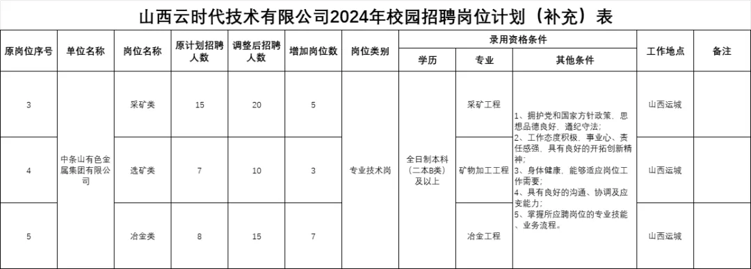 一、 山西云时代技术有限公司所属的中条山有色金属集团有限公司原计划招聘85人增加至100人,具体增加岗位及人数详见附件。