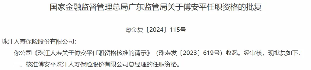5月15日,国家金融监督管理总局广东监管局批复,核准傅安平珠江人寿保险股份有限公司总经理的任职资格。
