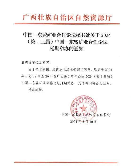 根据中国一东盟矿业合作论坛秘书处通知安排,原定于2024年5月22日至26日在广西南宁市举办的2024(第十三届)中国—东盟矿业合作论坛将延期举办,论坛配套展会2024中国—东盟矿业展随之延期,具体时间另行通知。