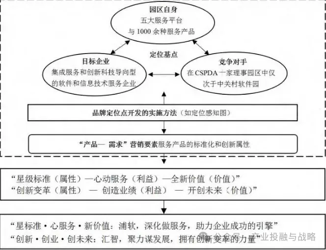 其中“产品-需求”要素是“3PC+ ”营销组合要素的核心所在,标准化工业园区也要尽可能在产品要素中识别品牌定位点。首先,参照目标企业、园区自身和竞争对手三个开发基准,浦软把其品牌定位于“3PC+”营销组合要素中的“产品-需求”要素,尤其强调其服务产品的标准化和创新两个属性。目标企业利益诉求客观存在,园区自身的资源能力真实可信,与对手园区相比存在竞争优势。