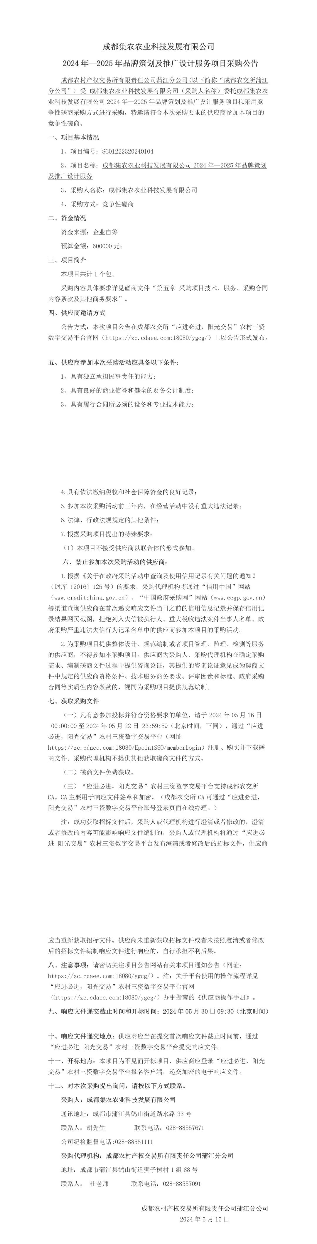 成都集农农业科技发展有限公司 2024年—2025年品牌策划及推广设计服务项目采购公告