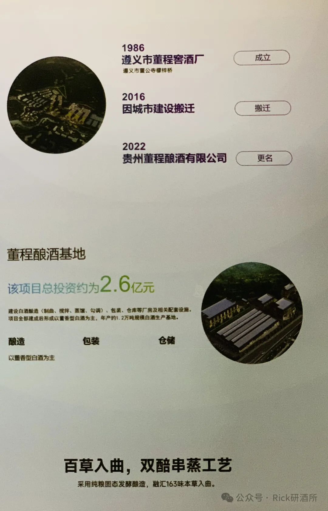 同年与遵义市汇川区人民政府签订招商协议,该项目总投资约为2.6亿元,主要建设集白酒酿造、蒸馏、制曲、搅拌、勾调、包装、仓库等生产车间及相关设施,项目全部建成后形成以董香型白酒为主,年产约8000吨规模白酒生产基地。