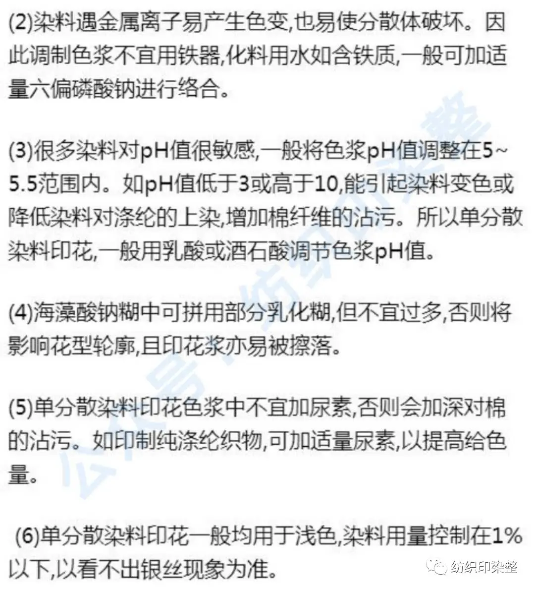 (1)溶解染料的温度控制在45℃左右,不宜太高,否则分散体被破坏,染料凝聚成颗粒,印花时易产生色渍。