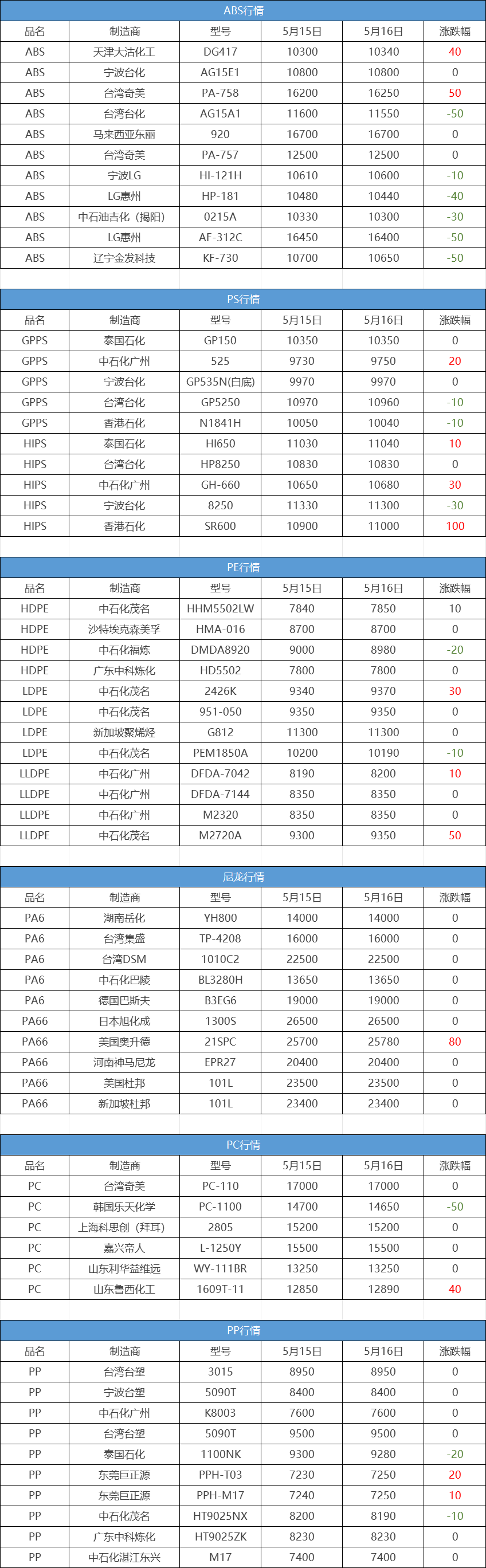 如果您要买卖ABS、PC、PP、PE、尼龙等原料,如果您想查看天津大沽、台化、奇美等厂家现货报价,点击进入小程序,即可查看30+材料每日价格行情,助您及时买卖!