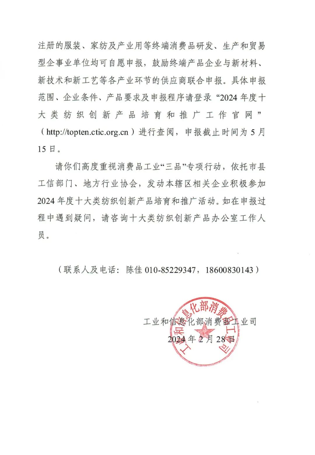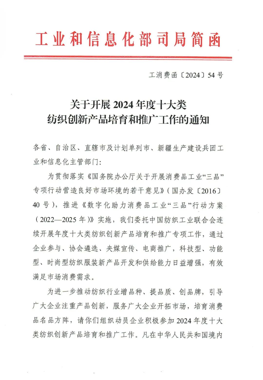 近日,工业和信息化部消费品工业司和中国纺织工业联合会相继印发了“关于开展2024年度十大类纺织创新产品培育和推广工作的通知”。