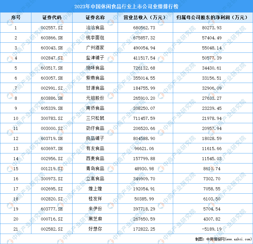 净利润方面,洽洽食品排名第一,归属母公司股东的净利润8.03亿元。桃李面包、广州酒家排名第二和第三,归属母公司股东的净利润分别为5.74亿元、5.50亿元。盐津铺子、绝味食品、紫燕食品、甘源食品、元祖股份、南侨食品、三只松鼠进入前十,依次排名第4-10名。