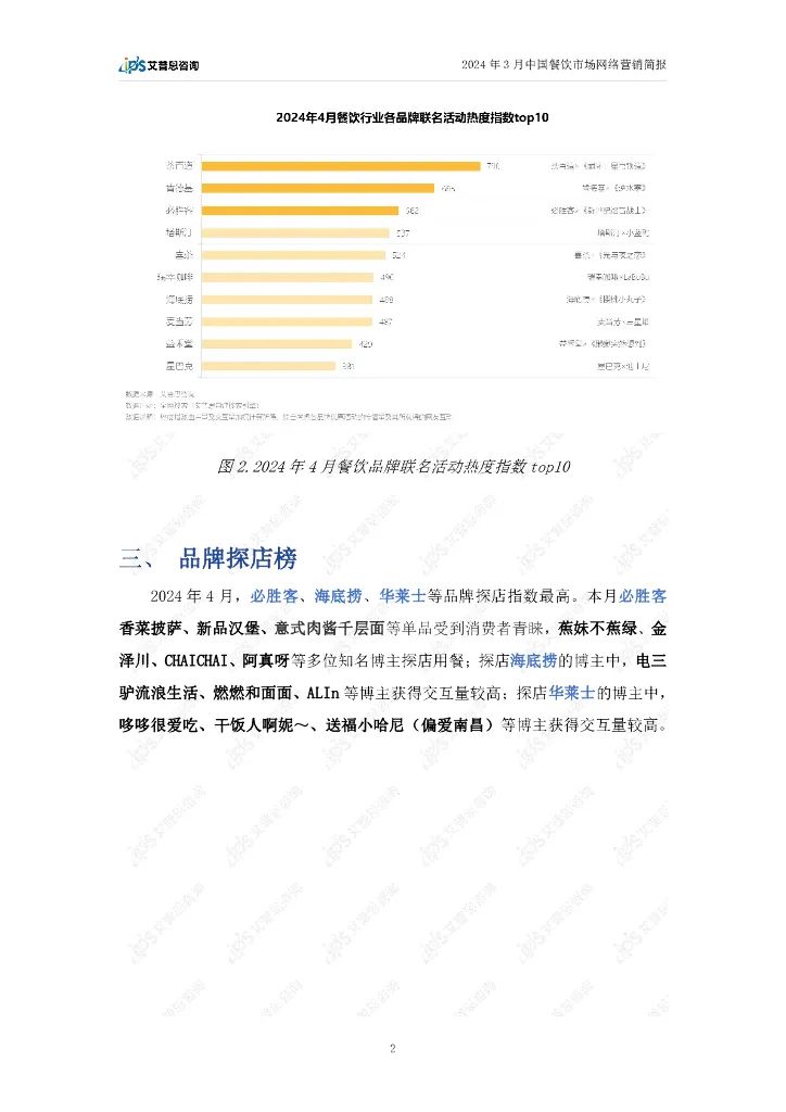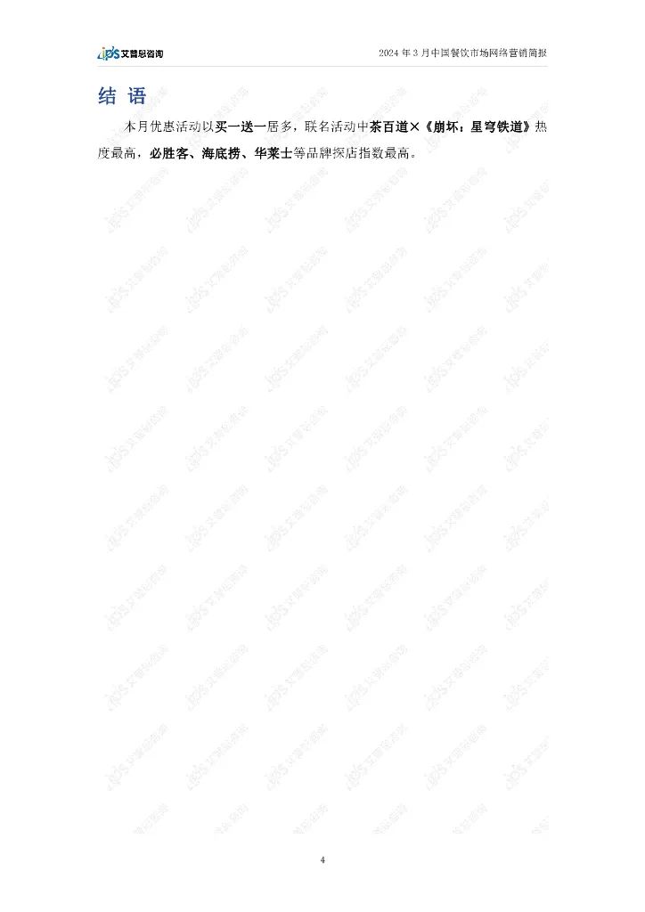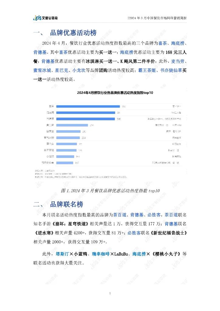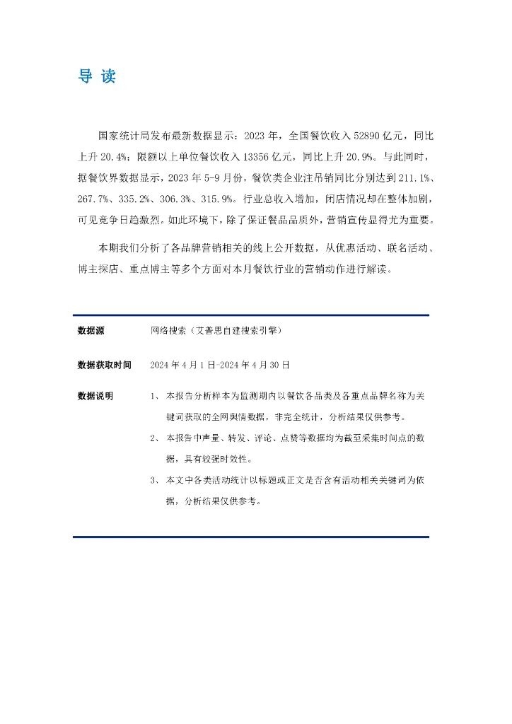 今天分享的报告是《2024年4月中国餐饮行业网络营销简报》,版权归艾普思咨询所有。