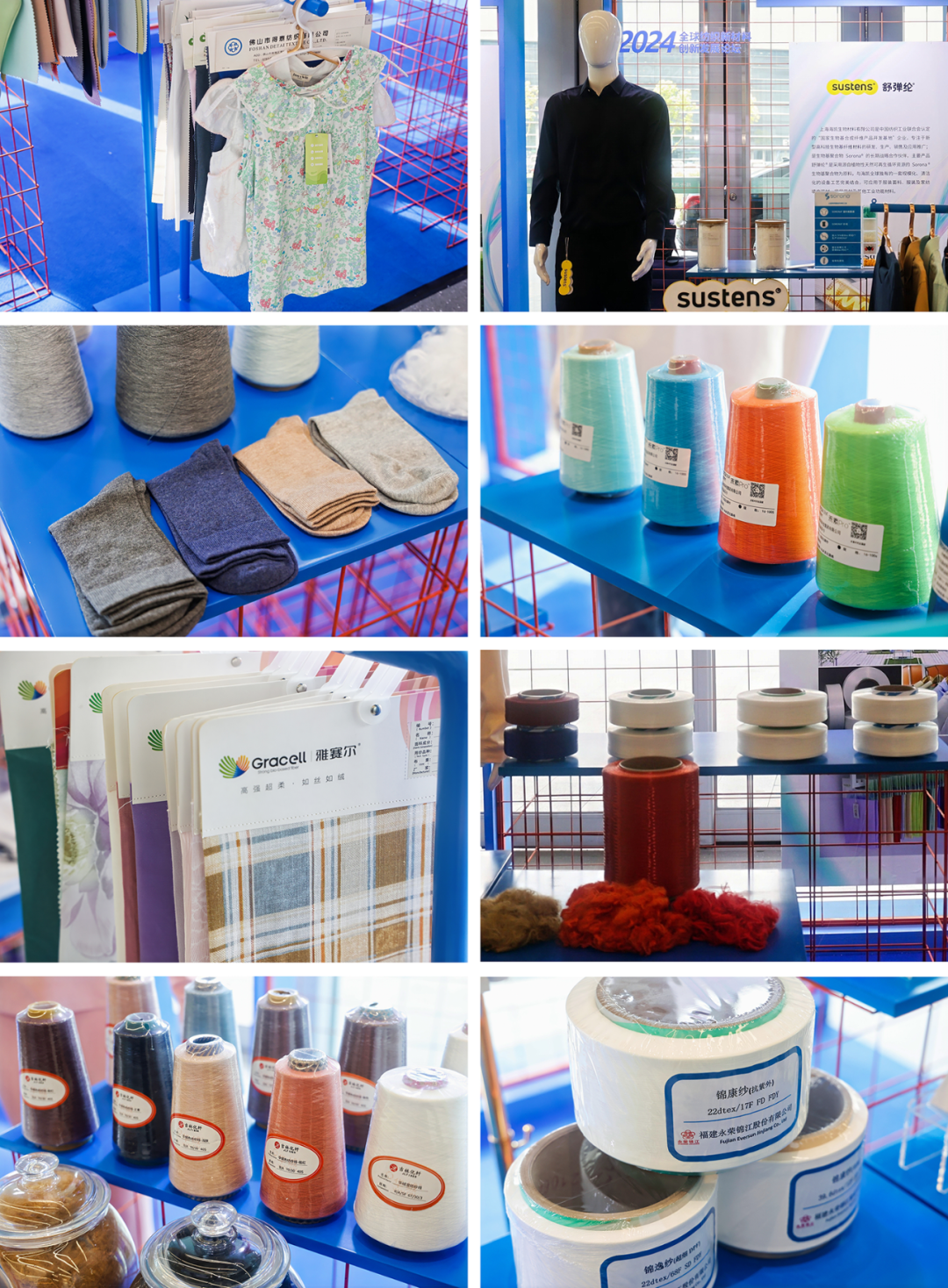 在论坛现场特别设立的纺织新材料展示区,集合了赛得利集团、上海海凯生物材料有限公司、山东艾文生物科技有限公司、南京禾素时代抗菌材料科技集团有限公司、宜宾丝丽雅集团有限公司、泰和新材集团股份有限公司、吉林化纤集团有限责任公司、福建永荣锦江股份有限公司8家行业优秀纤维企业,呈现了以企业特色纤维为原料研发生产的纱线、面料和服装等创新产品。展示产品具备防水、抗紫外、吸湿透气、抗菌等多种功能,应用范围覆盖了女装、男装、运动、内衣、童装等多个领域,多维全面地展现了新型纤维的开发方向和应用场景。