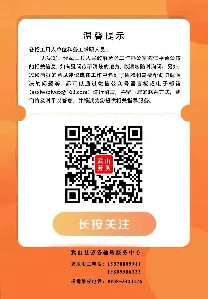 任职要求:初中以上学历,男工50周岁以下,女工45周岁以下。
