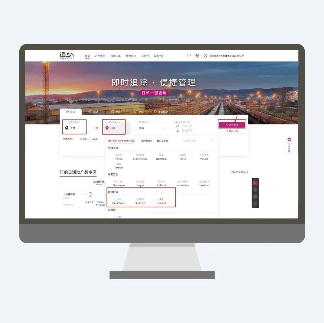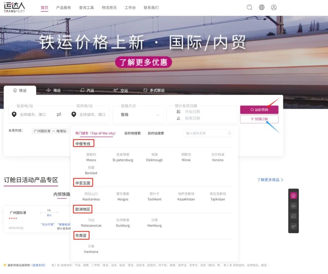 如果您有国际货运需求,您可以注册登录运达人官网(www.transpert.cn),查询俄罗斯、中亚、欧洲、东南亚、国内等地的【铁路】班期运价信息。使用运达人快捷订舱,确保货物运输的顺利进行。