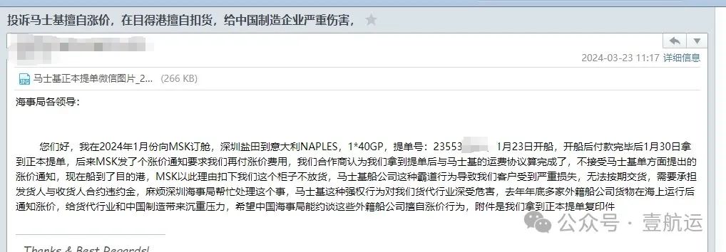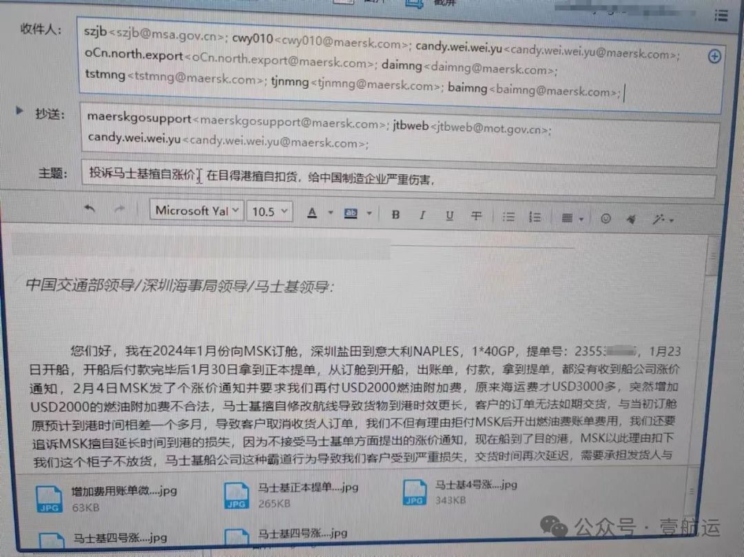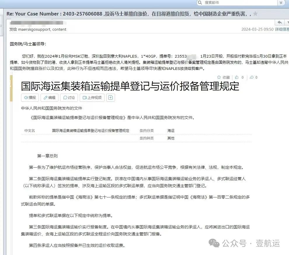 以下是一位支付完所有费用,货物到目的港被马士基扣货后,先后给深圳市海事局、深圳市区交委、中国交通部和中国国务院(收到国务院回执)发出的投诉函: