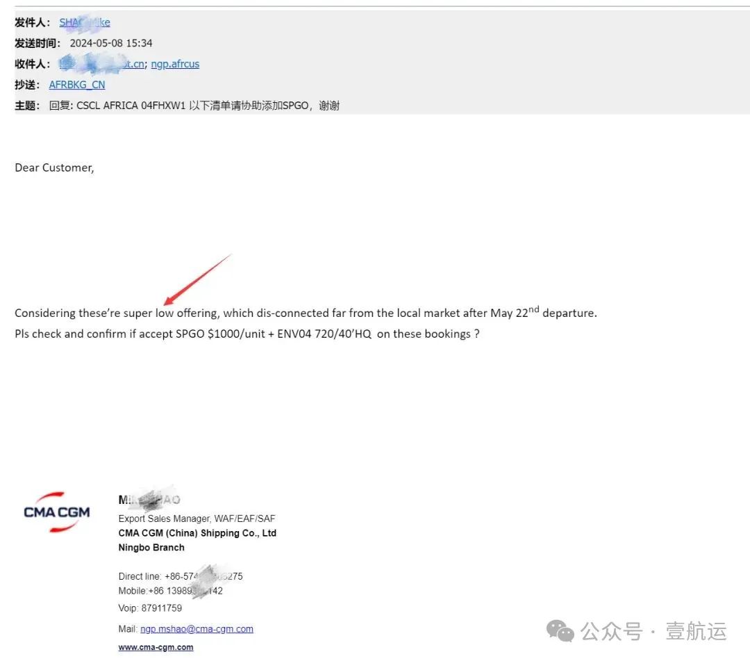 5月16日早上:该客户以USD7900/HQ的高价,在达飞订到了同一水船上去往同一个目的港的舱位!