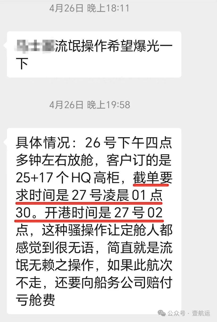 26号下午四点多钟左右放舱,客户订的是25+17个HQ高柜,截单要求时间是27号凌晨01点30。开港时间是27号02点,这种骚操作让定舱人都感觉到很无语,简直就是流氓无赖之操作,如果此航次不走,还要向船务公司赔付亏舱费!