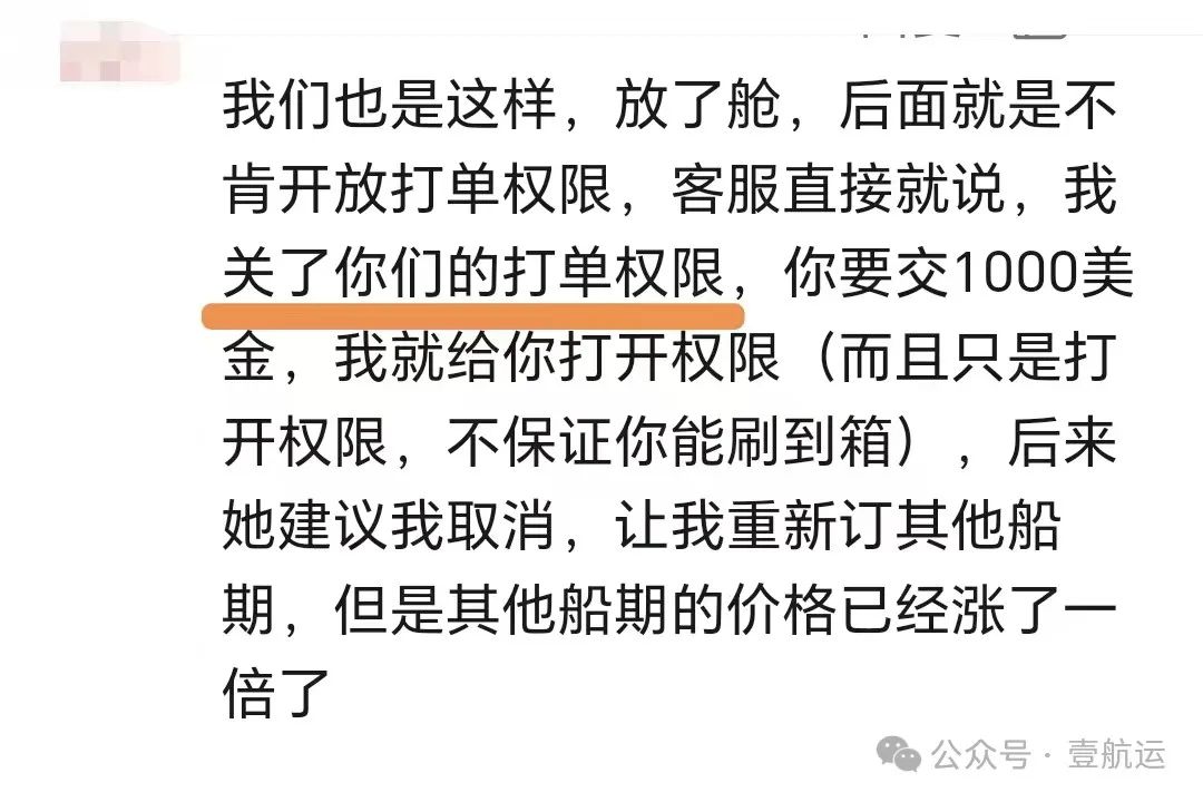 ▲不接受涨价就不给打单有货代反馈,船公司放了舱但不肯开放打单权限,找船公司客服询问原因,对方直言不讳说“我关了你们的打单权限”,要拿到打单权限先交1000美金再说!!!