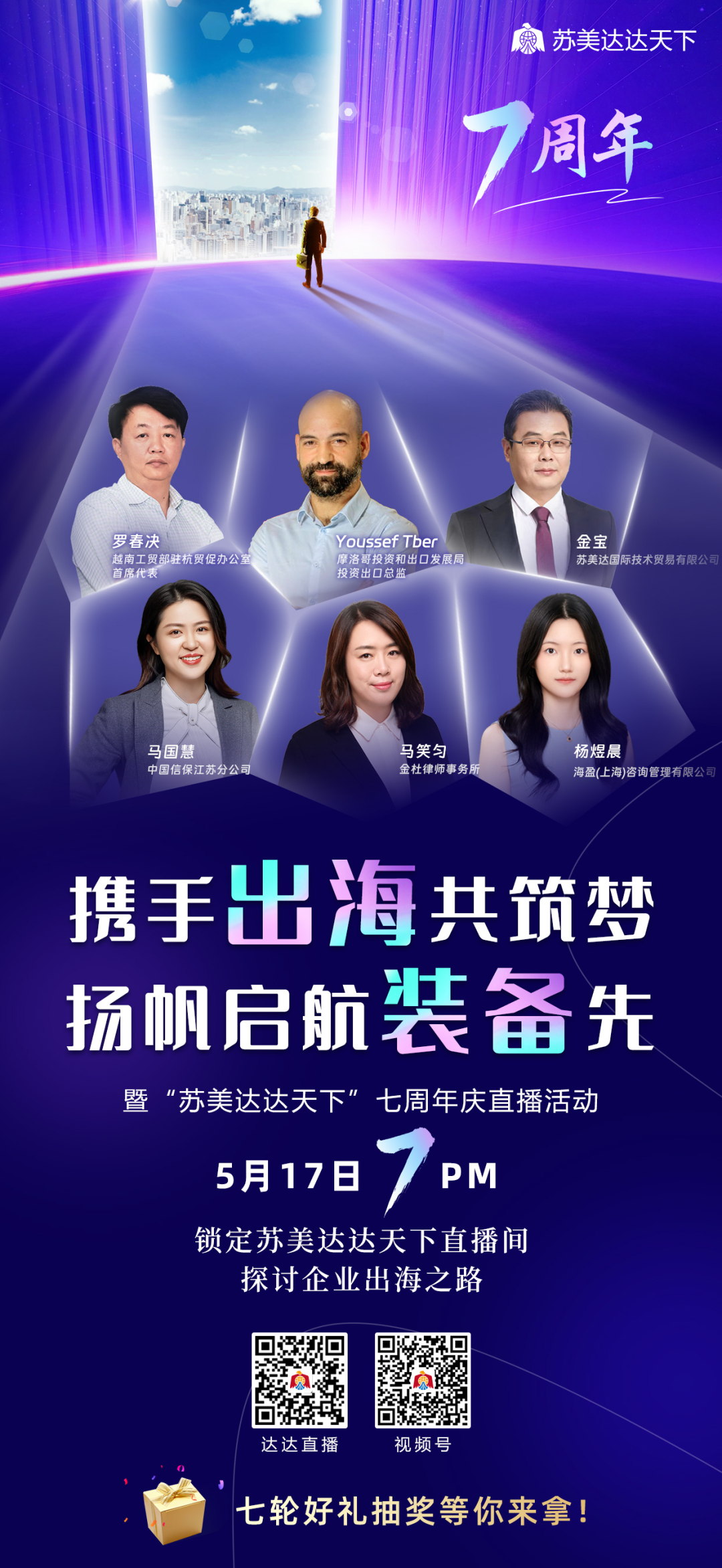 “苏美达达天下”将于5月17日晚上7点举行“携手出海共筑梦,扬帆启航装备先”七周年庆直播活动,本次直播将有海内外多位行业大咖莅临直播间,为大家带来全方位的“出海宝典”!
