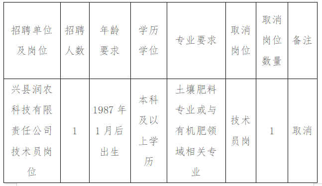 根据《吕梁润农科技有限责任公司2024年度公开招聘工作人员的公告》精神,结合岗位实际报名情况,由于无人报考兴县润农科技有限责任公司技术员岗位,不达比例要求。经研究,兴县润农科技有限责任公司技术员岗位的招聘予以取消,现予公告。