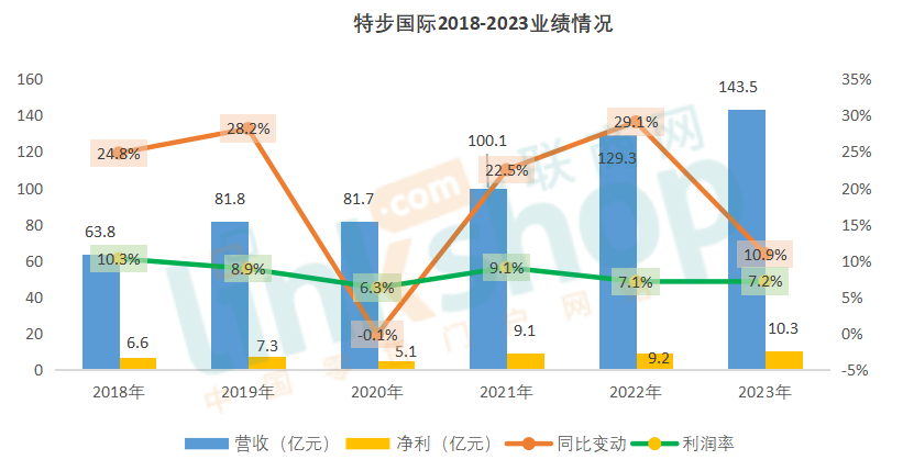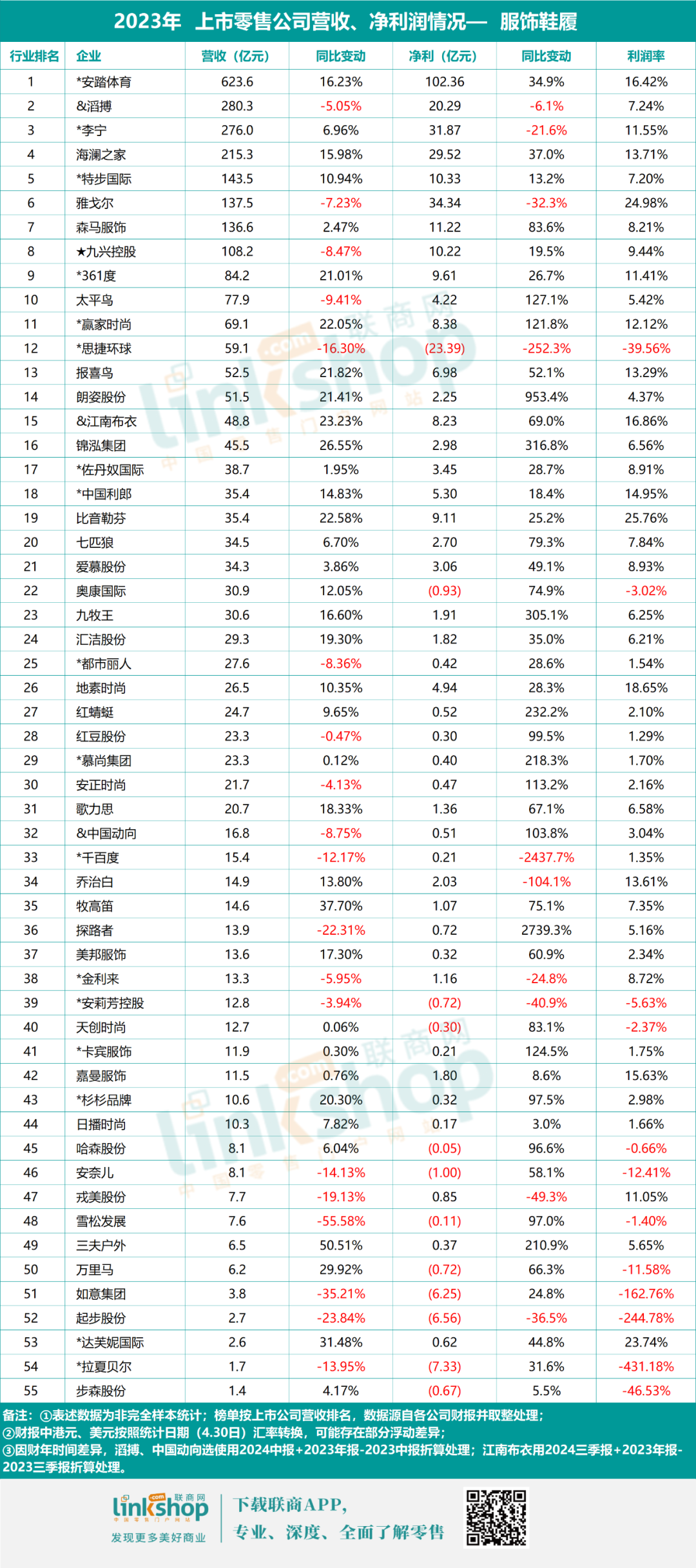 B.20-100之间规模的23家企业中,总利润率5.8%;仅有5家营收下滑,1家净利下滑,总体业绩表现趋好;唯有Esprit母公司思捷环球各项指标均不甚理想,从趋势上看,一代快时尚鼻祖走到了悬崖边上。