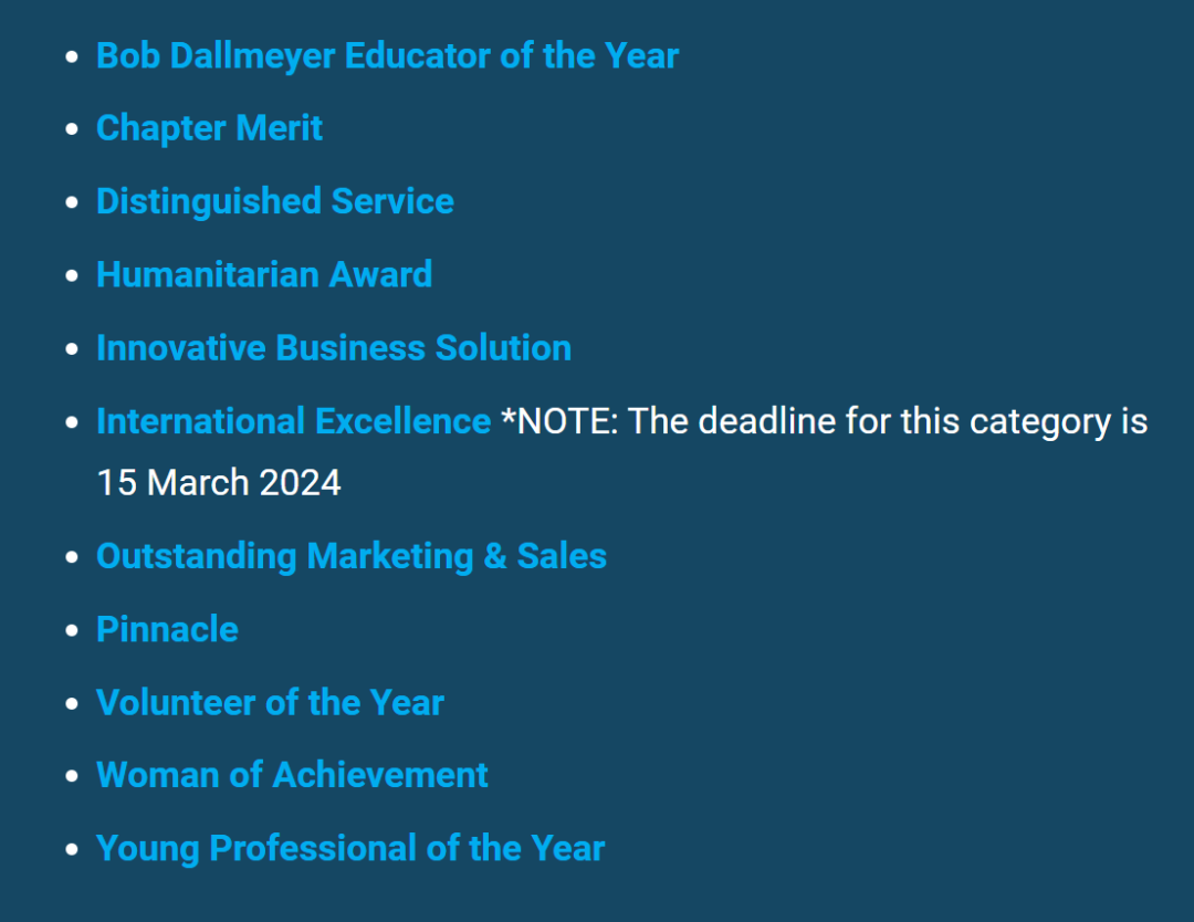 图为IAEE官网上公布的11个奖项类别,现接受提名。国际卓越奖的截止日期是2024年3月15日,其余10个奖项的提名截止到2024年8月30日。