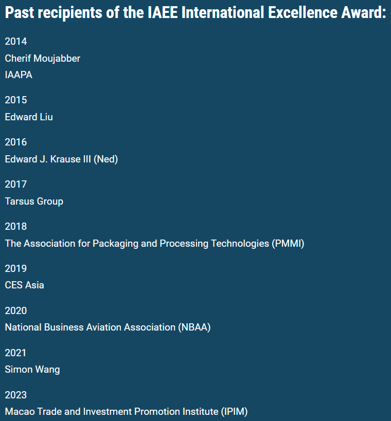IAEE 国际卓越奖旨在表彰 IAEE 成员或成员组织所举办的展览在国际活动方面取得了非凡的进步和/或通过教育和/或代表性在全球范围内提升了该行业的水平。