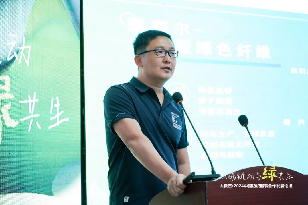 在《太极石健康纤维系列与服务战略》的分享中,太极石股份有限公司纤维事业部总经理王荣华表示太极石通过打造“3+N”的纤维产品系列,为下游客户提供了多种功能纤维解决方案。其中,兰丝尔纤维作为新一代可降解植物抑菌天然纤维,一定程度上实现了“代棉”、“代木”,有利于对森林资源、可耕地资源的保护。