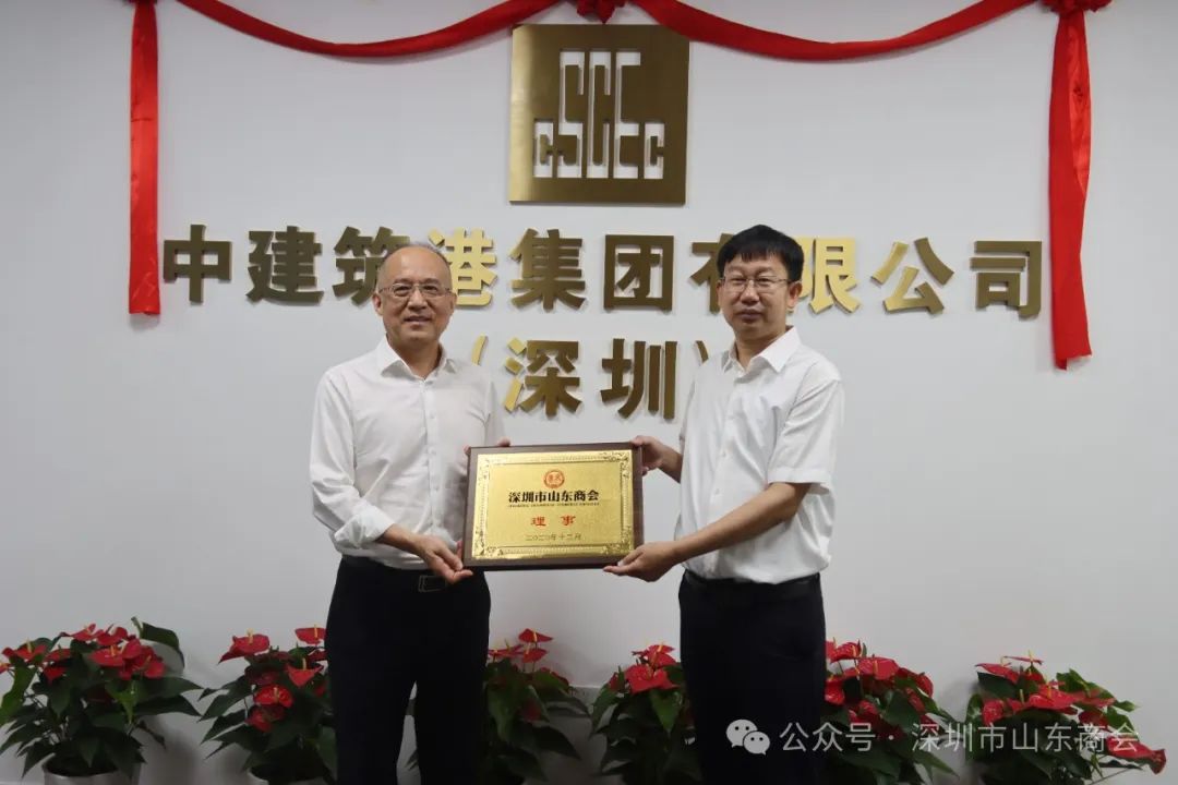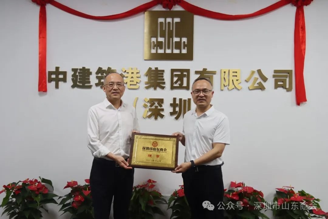 仪式上,王立新会长代表商会给中建筑港集团第一事业部深圳代表处授予“深圳市山东商会理事”单位牌匾。