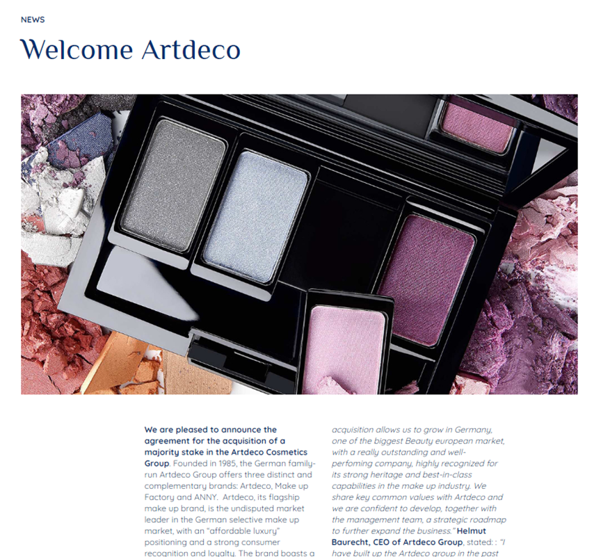 对于Sodalis而言,此次收购将促使其在德国发展壮大,在携手Artdeco后,双方将进一步扩大美妆业务版图。