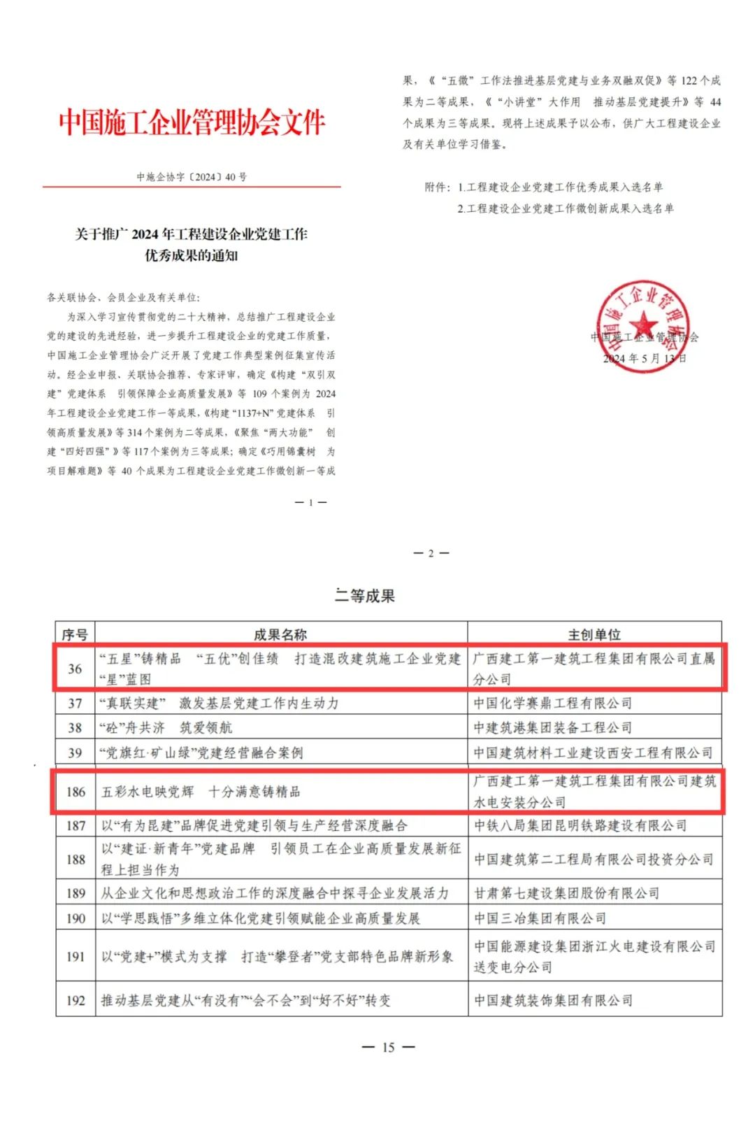 近日,在中国施工企业管理协会组织开展的党建工作典型案例征集宣传活动中,一建集团直属分公司党建品牌《“五星”铸精品 “五优”创佳绩 打造混改建筑施工企业党建“星”蓝图》、建筑水电安装分公司党建品牌《五彩水电映党辉 十分满意铸精品》被中国施工企业管理协会评为2024年工程建设企业党建工作二等成果。