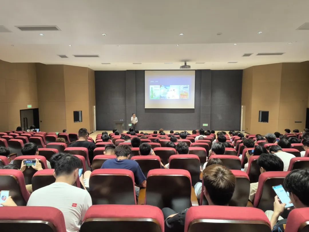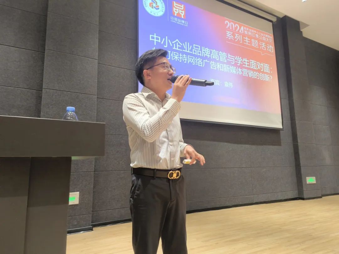 2024首届全国中小企业品牌营销案例征集公益大奖系列主题活动在重庆移通学院合川校区正式启动。5月15日,作为大奖系列主题活动之一的“高管大课堂——中小企业品牌高管与学生面对面”邀请到实战营销专家袁伟在六度空间105°C学术报告厅开展了“如何保持网络广告和新媒体营销的创新?”的讲座。《网络广告与新媒体传播》课程组的杨梦雅老师、邱宇常老师、冯胜男老师及200名学生参与了此次主题学习。袁总曾任职于多家知名快消品企业的市场部,是中国大学生广告艺术节学院奖专家评审团评委,重庆德普外国语学院商赛荣誉导师,有十五年快消品市场营销精准施策和落地执行的经验,擅长年轻化和数字化的品牌管理工作。本次他为学生们带来了生动丰富的经验分享,促成了课程理论与实践案例的融合,丰富了学生课堂体验。