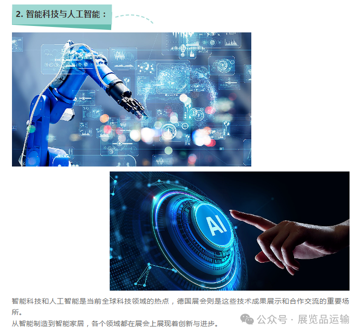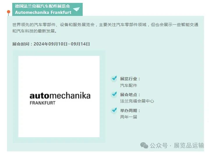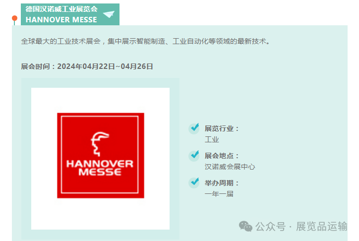 大家如果对参加德国展会感兴趣的话,联系我们获取最新的展会信息,为您提供一站式展品运输服务!专业、安全、顺心、无忧是我们的服务理念,展览品运输首选展汇物流!