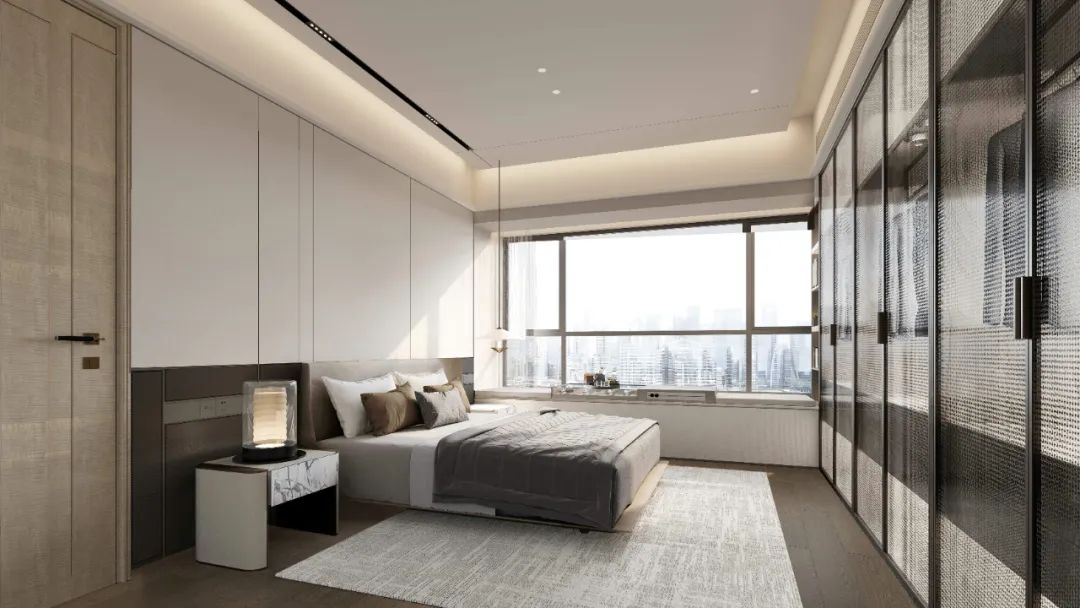 主卧的尺度感,也堪称一绝。贯穿南北,朝南面宽超3.9m。一整面墙的通顶衣柜+化妆区,储物容量是真的很大!引入“主卧小家化”概念,超大独立卫浴空间、景观大飘窗,尊贵感、私密感足。