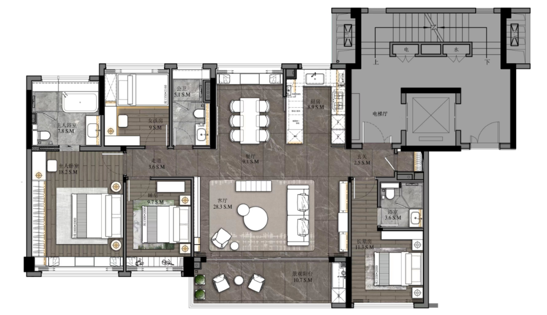 在四房格局上,直接采用酒店式双套房配置,将舒适度拉满,三代同堂的也能照顾到每一代人的私密舒居感受。