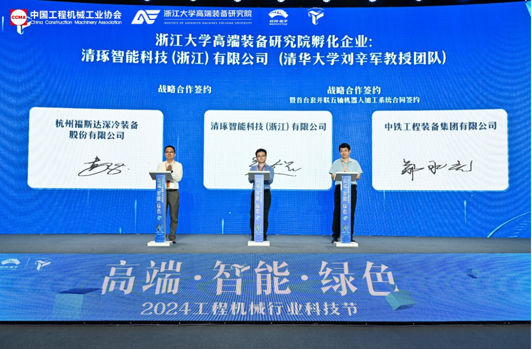 在产学研项目签约仪式上,清琢智能科技(浙江)有限公司与中国中铁工程装备集团有限公司、杭州福斯达深冷装备股份有限公司进行战略合作签约,将为工程机械行业带来新的合作机遇和发展空间。