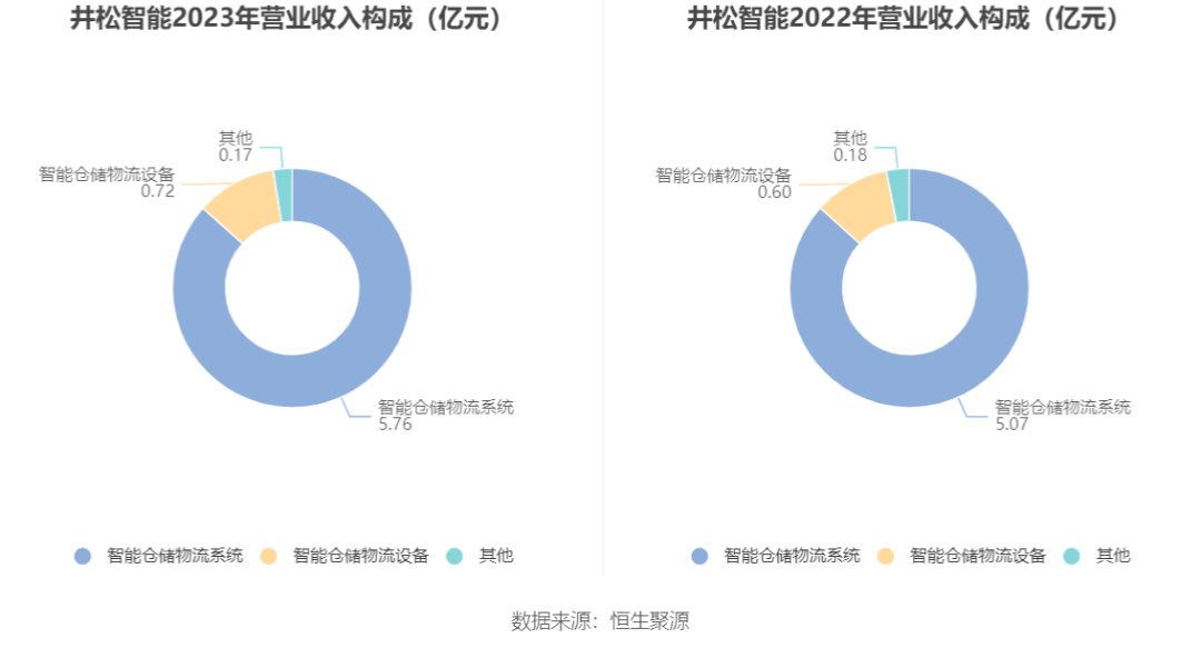 2023年,井松智能实现营业总收入 6.64亿元,较上年同期增长 14.24%。从产品来看,2023年井松智能主营业务中,智能仓储物流系统收入5.76亿元,同比增长13.61%,占营业收入的86.69%;智能仓储物流设备收入0.72亿元,同比增长19.98%,占营业收入的10.86%。