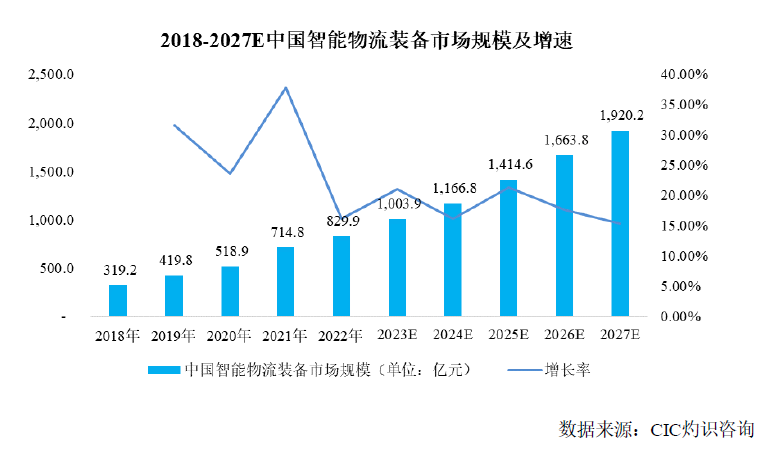 中国市场一直具备广阔的增长空间与活力。根据灼识咨询有关数据,中国智能物流装备市场规模从2018年的319.2亿元增至2022年的829.9亿元,复合年增长率(CAGR)达到27%,预计2027年可达1920.2亿元,未来五年CAGR高达18.3%。其中新能源行业未来五年CAGR为33.1%。智能仓储物流系统应用服务领域不断深化与拓展,新零售、第三方物流等新兴行业的智能仓储物流应用也在快速发展。在互联网革新进程下,数字化、智能化的需求推动了传统工业物流、仓储供应链、运输等物流领域的变革。智能仓储已逐步渗入更多新兴行业中。