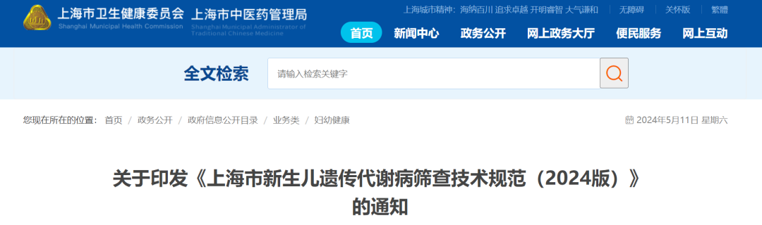 5月11日,上海市卫健委发布了《上海市新生儿遗传代谢病筛查技术规范(2024版)》。