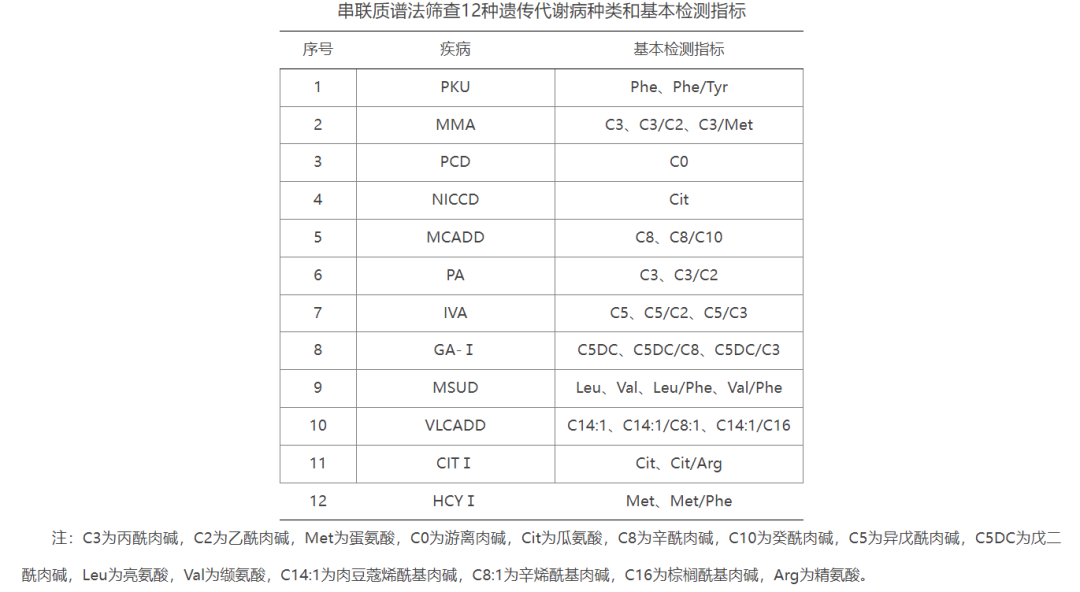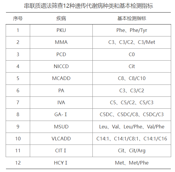 采用串联质谱法筛查PKU、MMA、PCD、NICCD、MCADD、PA、IVA、GA-Ⅰ、MSUD、VLCADD、CITⅠ、HCYⅠ等12种疾病。