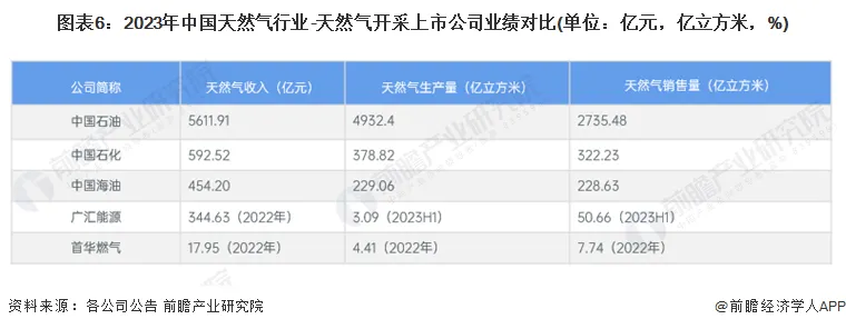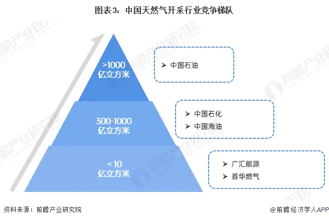 依据天然气开采企业产量划分,中国天然气开采行业企业可分为3个竞争梯队。其中,年产量大于1000亿立方米的企业有只有中国石油;年产量在300-100亿立方米之间的企业有中国石化和中国海油;其余企业的年产量在10亿立方米以下。