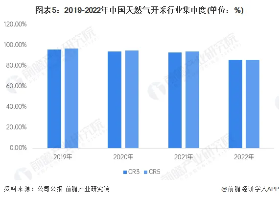 根据2022年前各公司天然气产量来看,天然气开采行业CR3和CR5都超过了95%。总体来看,我国天然气开采行业参与者数量少,多为中国海油、中国石油、中国石化等大型央企,市场集中度高。