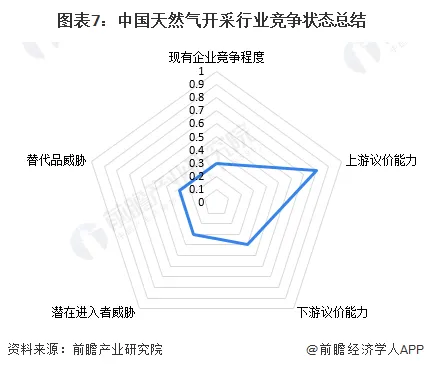 从五力竞争模型角度分析,目前,我国天然气开采行业竞争者数量较少,由中国海油、中国石化、中国石油占据着天然气开采行业的主要市场份额,市场集中度较高。