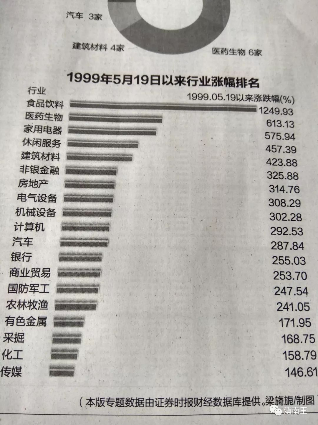 这是1999年到2019年最近20年来各行业的涨幅!涨幅最大的是食品饮料行业!是涨幅第二医药生物和涨幅第三家用电器涨幅之和!