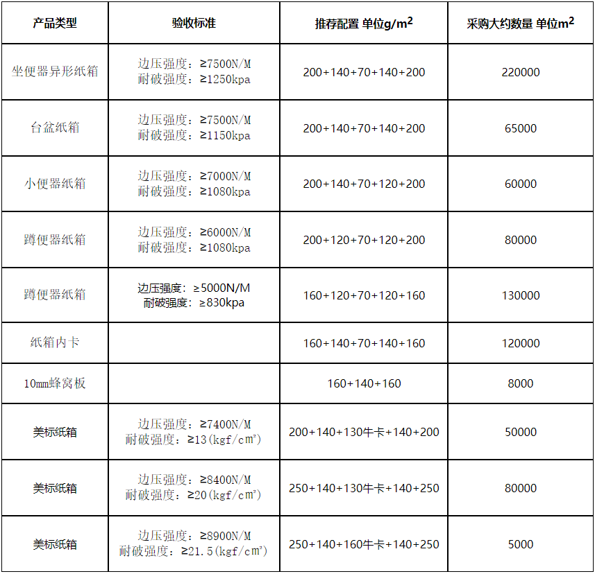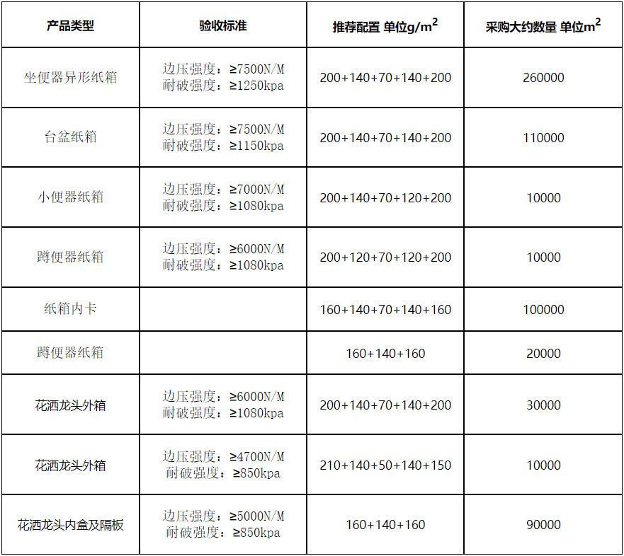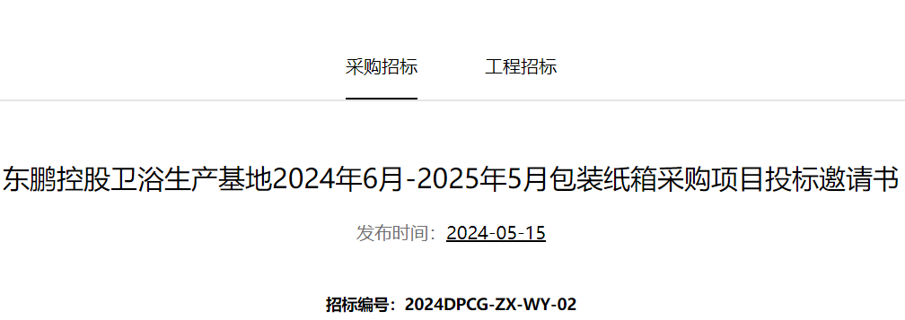 日前,《东鹏控股卫浴生产基地2024年6月-2025年5月包装纸箱采购项目投标邀请书》发布,涉及其江西、江门两大生产基地。有意向的纸箱包装企业可在5月25日前投标。
