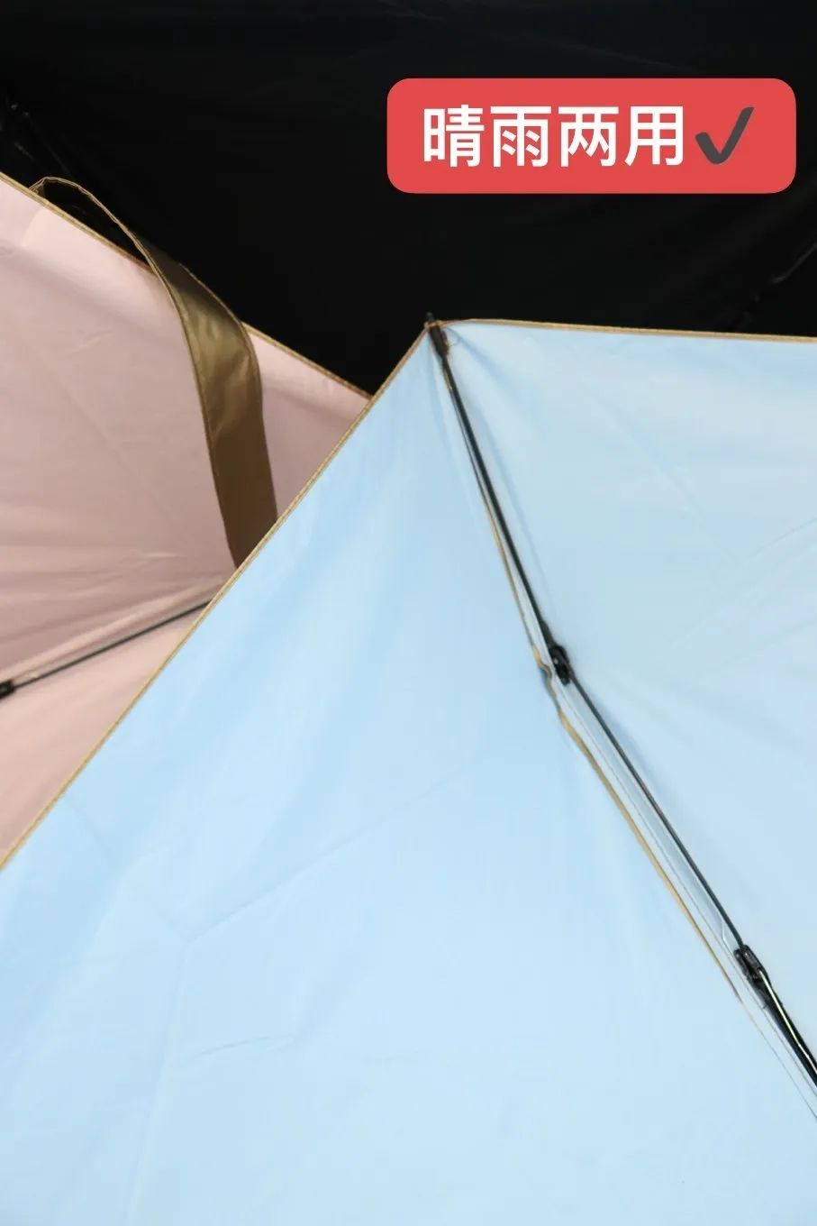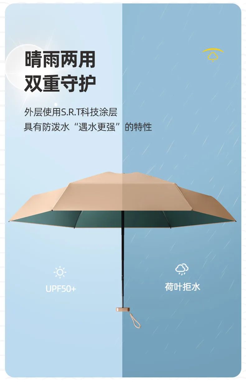 很多太阳伞,只要沾水,防晒性就会变差,而小金伞是一把真正的晴雨两用伞。伞的外层使用S.R.T科技涂层,具有“防泼水”、“遇水更强”的特性,就算是大暴雨 雨水也无法渗透到雨伞内部破坏防晒涂层,从而保证了小金伞的优异的防晒性。