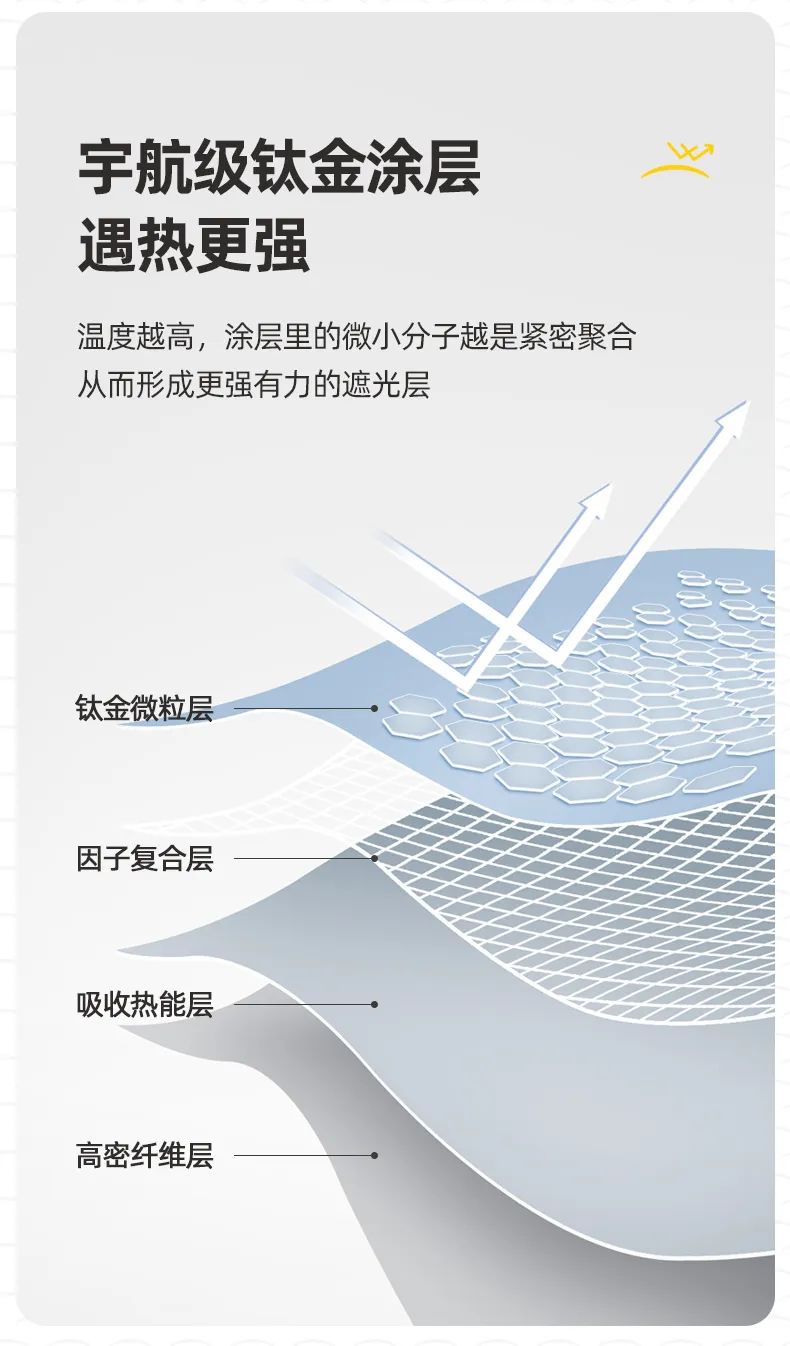 独创宇航级钛金防晒涂层 具有“遇热更强”的黑科技特性 当外界温度越高,涂层里的微小分子越是紧密聚合,从而形成更强有力的遮光层,可以大大提升紫外线防护效果。