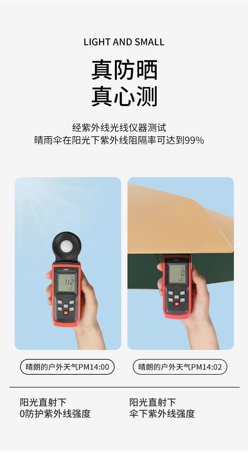 作为宇航级防晒伞,防晒系数肯定好。经权威检测机构鉴定,小金伞防紫外线系数UPF>50、UPFAV>2000 是远远超过国家规定的标准,防护系数更是行业之最;对紫外线的阻隔率≥99%,做到了真正“0”透光,想晒黑都难!