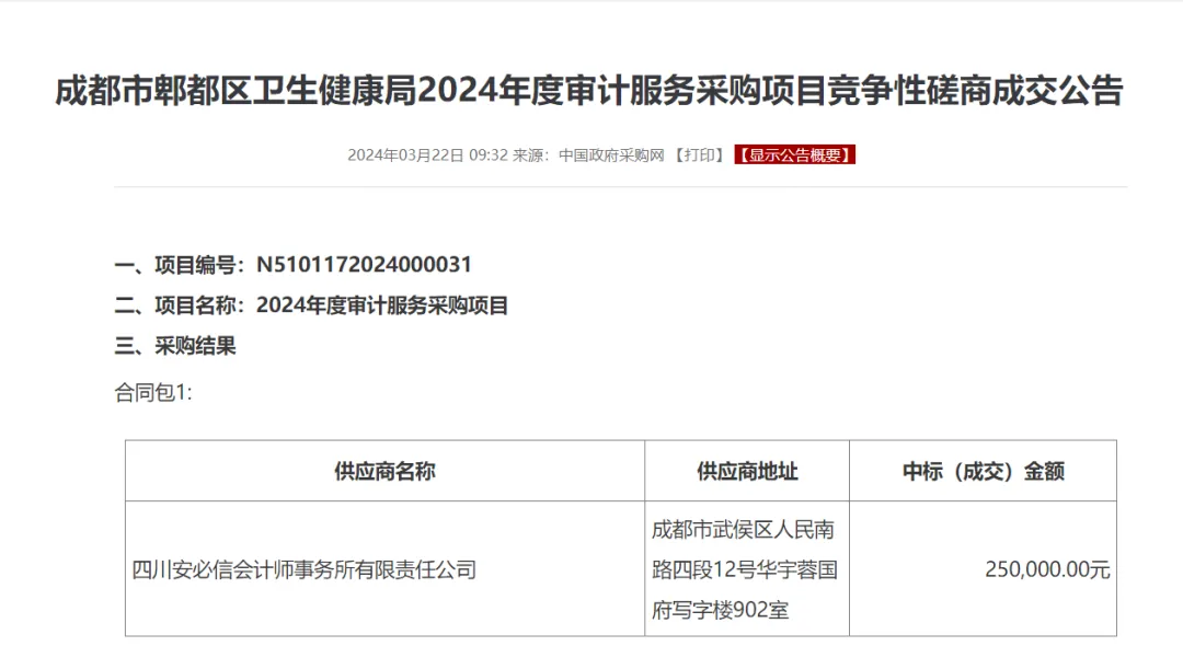不久前,成都市郫都区卫健局对“2024年度审计服务采购项目”进行招标,并在3月下旬由一家会计师事务所中标,预示着新一轮审查即将展开。