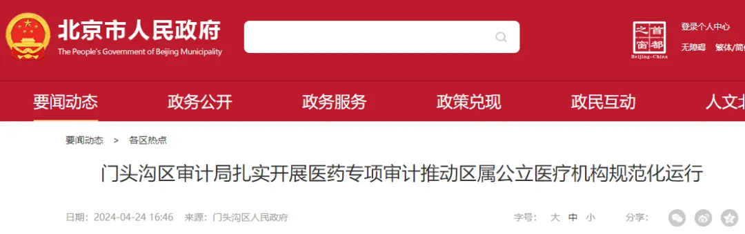 如4月24日,北京门头沟区审计局启动区属公立医疗机构医药采购管理情况专项审计,审计对象涵盖3个医药领域主管部门、4个区属公立医院及9个社区服务中心。