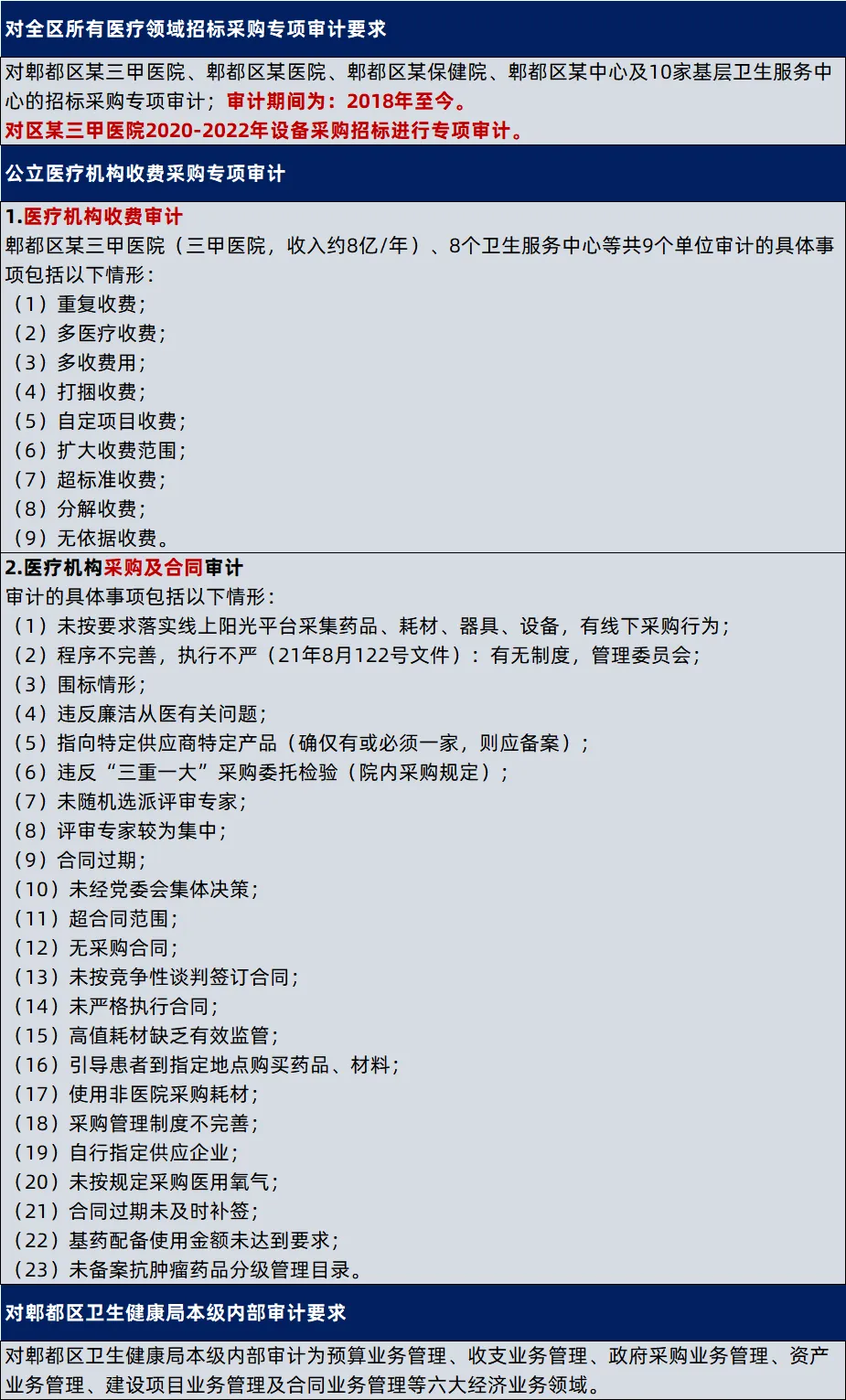 据采购公告,此次审计范围包括一家年收约8亿元的三甲医院,以及十余家基层医疗机构。重点领域包括医疗机构收费审计、采购及合同审计,以及全区所有医疗领域的招标采购专项审计。