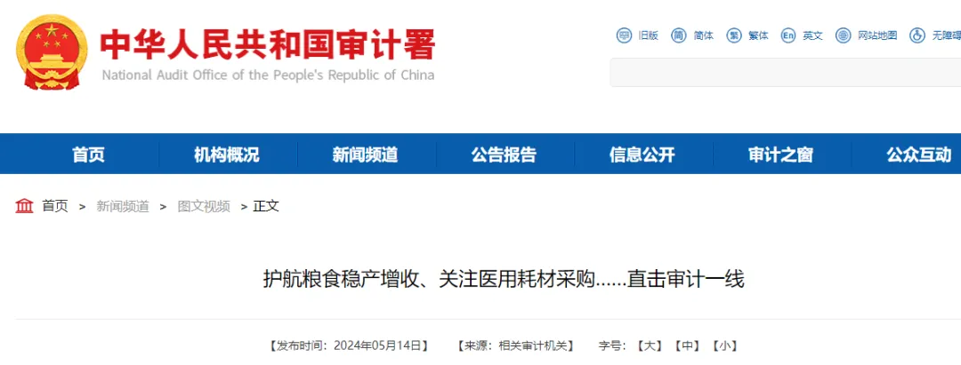 5月14日,国家审计署官网发布了题为《护航粮食稳产增收、关注医用耗材采购……直击审计一线》的文章,医院耗材设备的采购正成为审计一线严查的重点。
