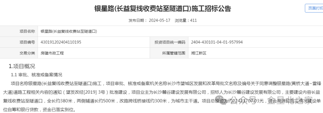 4月12日,官方发布了《银星路(长益复线收费站至隧道口)施工招标计划》,告知该项目正式招标公告预计发布时间为2024年05月13日。