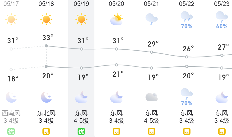 今日晴转多云,气温19-30度,东风4-5级,出门请注意防晒。